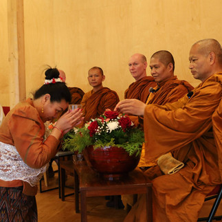 Dagen startet med ulike matstasjoner forberedt av våre frivillige for å ønske lekfolkene velkommen til fortjenesteseremonien. Deltakerne deltok i ofring av almisser og mat til Sanghaen (munkefellesskapet) før de delte et måltid sammen. Atmosfæren var varm og vennlig, slik den har vært hvert år.